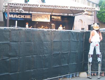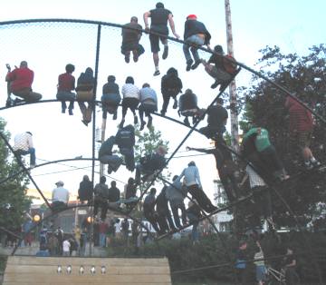 HERE’S SOME MORE CAPITOL HILL BLOCK PARTY images from a few weeks back, that of several baseball-backstop climbers and one clever stilt walker viewing Sleater-Kinney for free.
