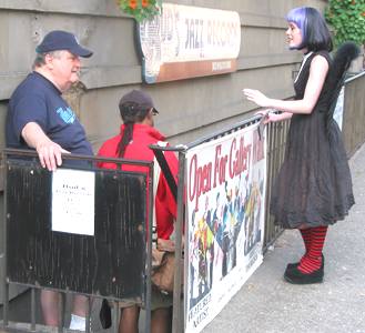 AT AUGUST’S FIRST THURSDAY ART WALK, painter Jessica McCourt found out her exhibit at Bud’s Jazz Records didn’t make the newspaper listings. So she did her own leafleting, dressed up as one of the characters from her show “Saints, Sinners, and Monkeys.”