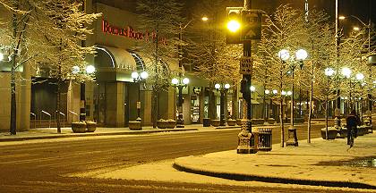 AFTER TWO DAYS official threats/promises, the ultra-rare March snow came to Seattle Thursday night. It was bee-yoo-tee-ful. I was out in it on my regular First Thursday gallery crawl, and saw the city itself become a temporary art installation, an arrangement of pointillist streaks and abstracted white textures. Of course it didn’t last; it never does. But during the mini-storm’s eight-hour life, it was a mini-vacation from dreary late-winter reality.