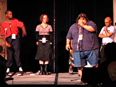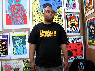 Below, ex-local poster-maker Jermaine Rogers wears an inside joke about our ol’ pal Art Chantry, the most famous current poster boy to refuse to attend Flatstock. (Chantry has always insisted he hates computer graphics.)