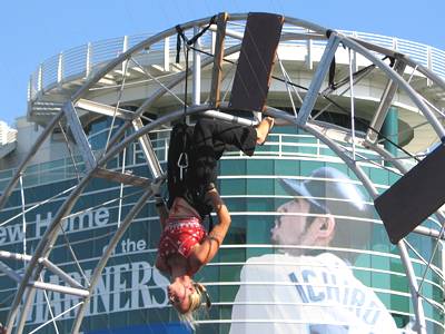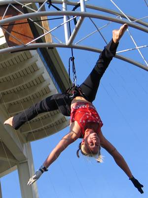 The performance-art group Mass Ensemble strung its giant “Earth Harp” from the Space Needle, where LA dancer/singer/yoga teacher Andrea Brook attracted attention from all with her acrobatic musicianship.